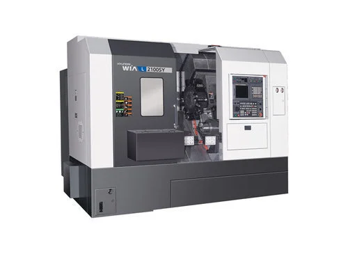 The HYUNDAI WIA L2100Y/SY Multitasking Turning Center features a wedge type Y-axis and BMT 65 (or VDI140) turret enable multitalking with synchronized main (8”) and sub (6”) spindles, allowing complex parts to be machined in a single setup.